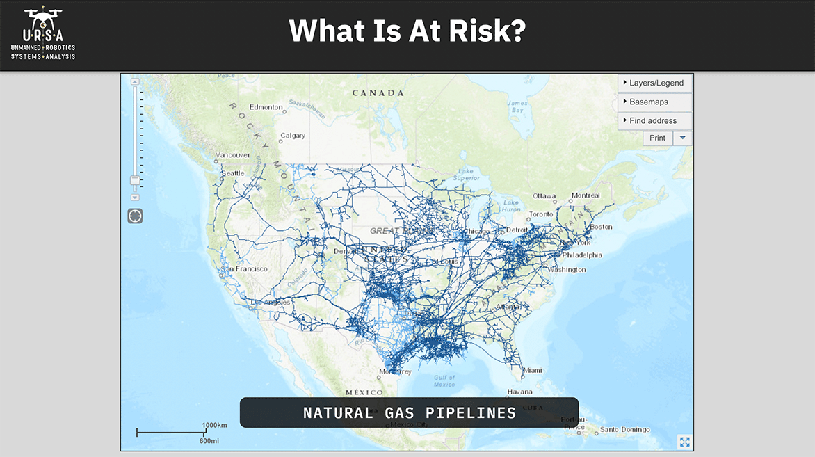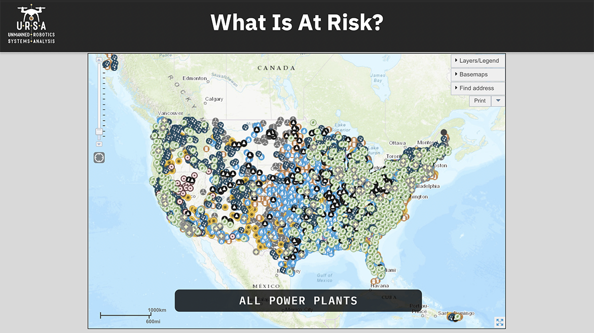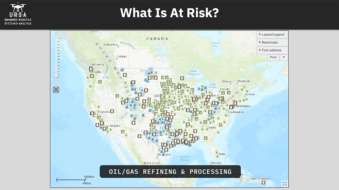 I’m live in New Hampshire. This is just all the power plants in the United States. There’s an awful lot of them and there’s a surprising number of nuclear reactors in here, including one that’s 20 minutes away from my house, which I often times forget. There are an enormous number of oil and gas refining and processing facilities scattered around the country. You’ll notice there’s a lot of the Midwest. I used to drive between Washington, D.C. and New Hampshire all the time and so I’d see the ones in New Jersey. I saw a bunch down in Southern California. There’s a lot of it down around the Gulf Coast and we’ll get to that in a minute. There’s a lot of natural gas pipelines. Thankfully, a lot of these are buried but not all. There’s also oil pipelines and other transmission systems on the surface that are potentially vulnerable, crude oil, petroleum, etc. What’s left out of these graphics is high transmission lines, which are getting a lot more attention after the fire in Northern California last year that was caused by poorly inspected high transmission lines. Those are becoming much more of an area of concern so if the energy infrastructure is the thing that we believe is at risk what is creating that risk in the context of this conversation. We’ve been talking about UAVs and so let’s get down in some specifics.